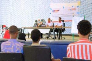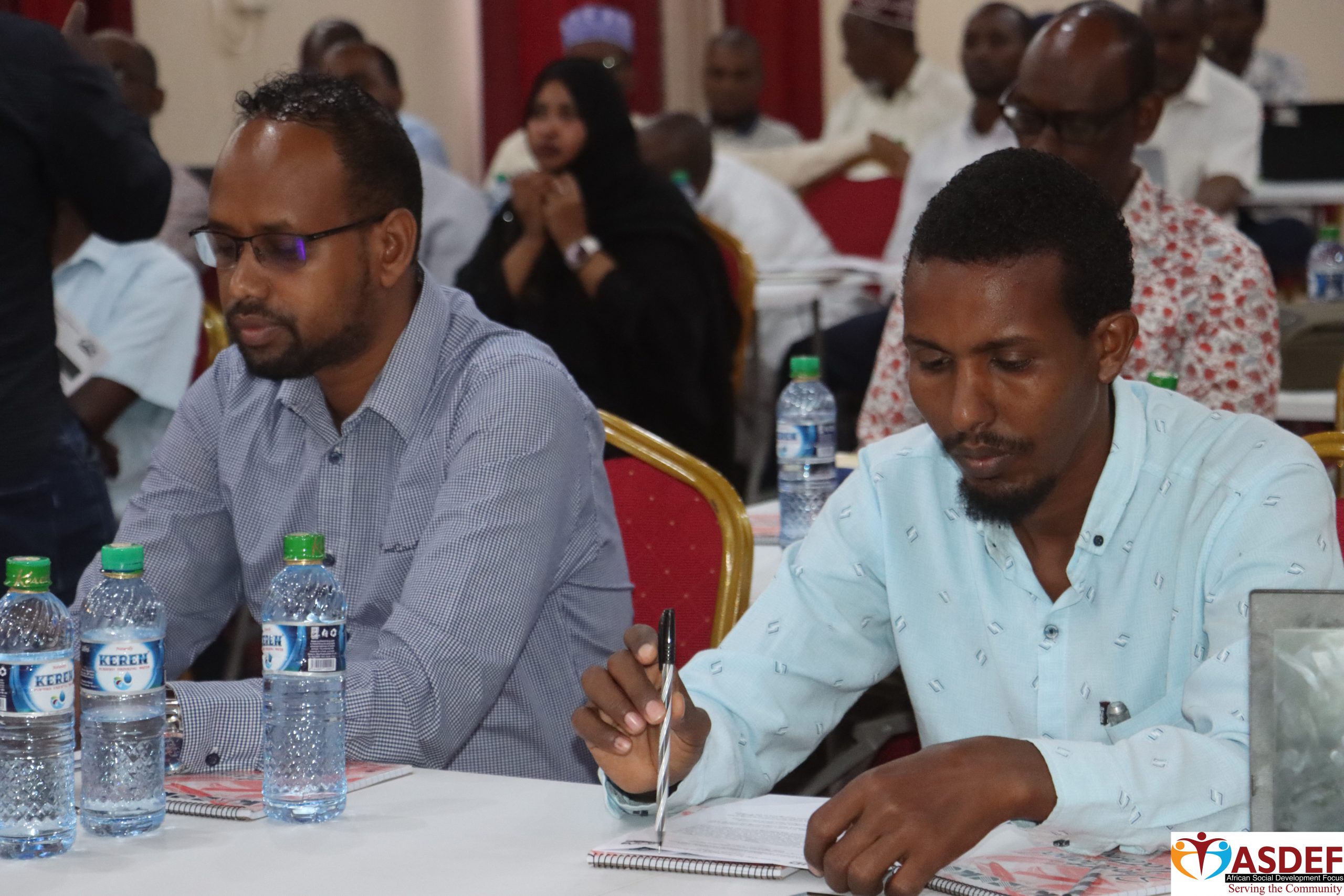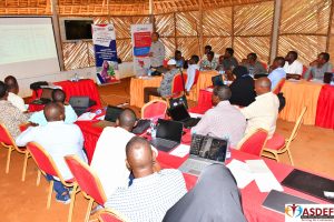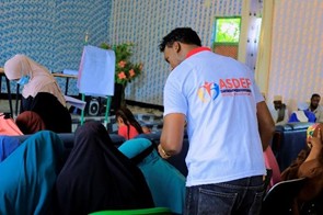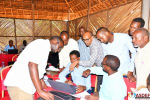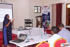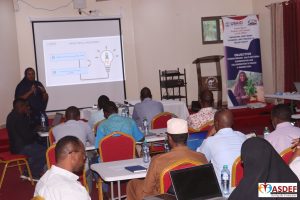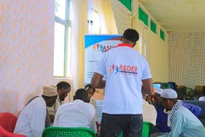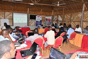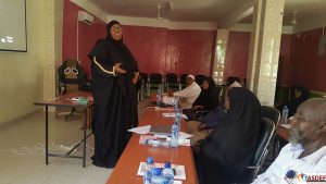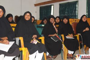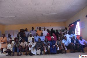 ASDEF GESI staff explaining the concept of SGBV before giving out some post-test papers to the participants