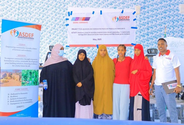 Group photo taken after ASDEF’s awareness training on FGM, SGBV, and early marriage, featuring our GESI staff (left), Ms. Tigist a secondary school teacher with her three students (center), and our Program Coordinator (far right)